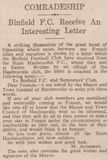The letter continues with the Harbourdin Mayor and Town Council offering to do all they can to make ‘mobilised’ Binfield club members as comfortable in France as they can under the circumstances.