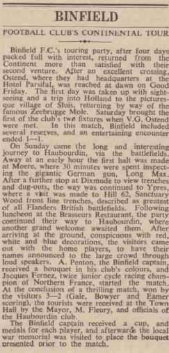 It’s a familiar tale to hear of football clubs such as Manchester United, Arsenal and Chelsea spending their summers jetting off to Asia on money-spinning foreign tours. However, in the long and distant past many non-league sides used to travel abroad to play a game or two and our very own Binfield FC did exactly that in April 1939 writes Steve Gabb.